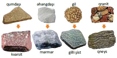 Məsələn: Mərmər, Amfibolit, Kvarsit, Hornfels, Miqmatit, Şist, Qneys, Sleyt və s.